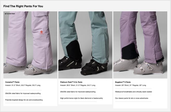 Sometimes that means going beyond copy. When asked to update language on our ski pants, I proposed this compare table to do what copy can’t accomplish alone. This was a partnership with graphic design and merch. And a quick turn at that.