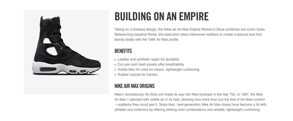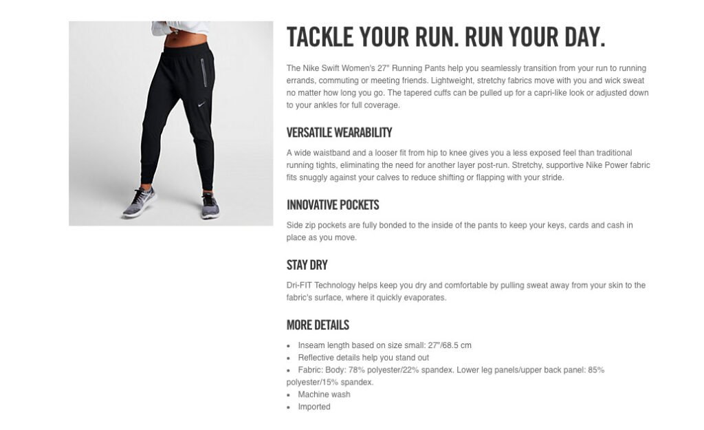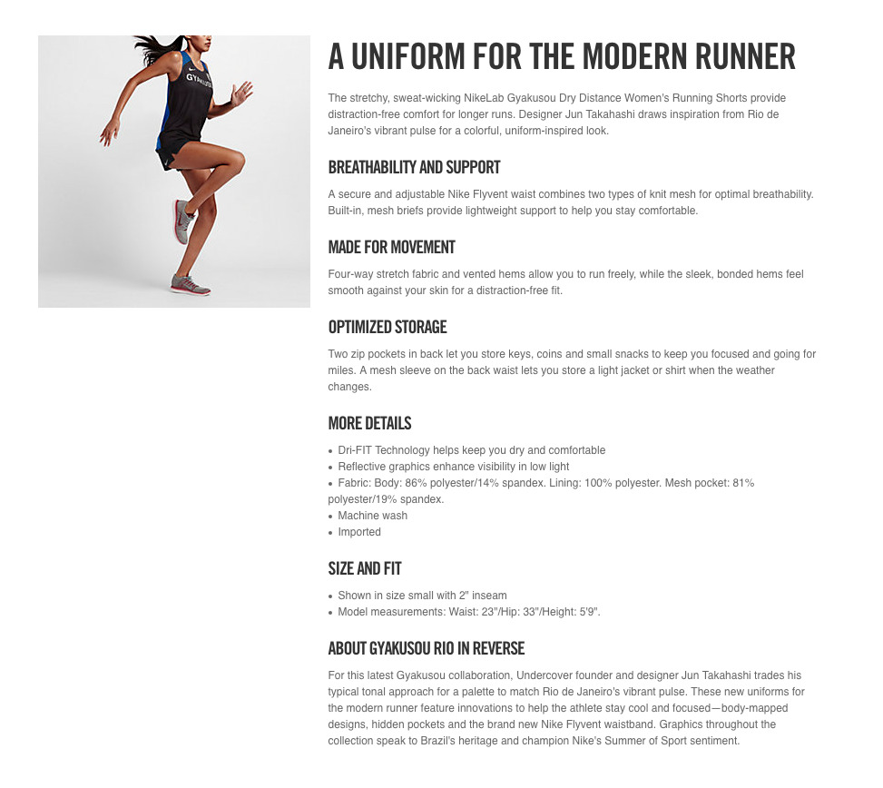 I had the opportunity work with NikeRun on A/B testing product descriptions for voice and level of detail. Consumers converted almost 10% more on pages with much detail in an accessible tone.